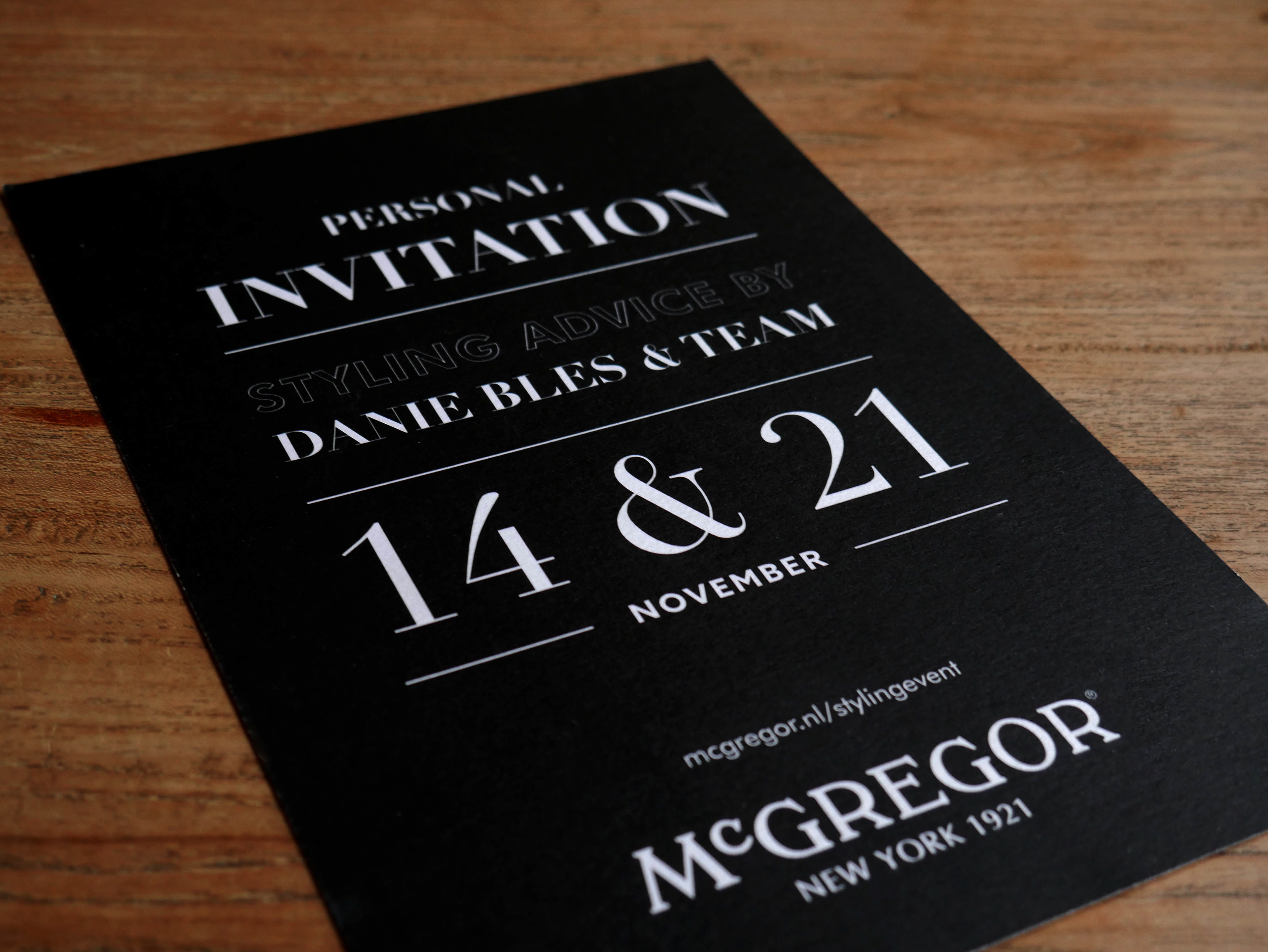 VIP invitation for the McGregor x Danie Bles personal styling event. Printed on black paper with a sparkly finish.